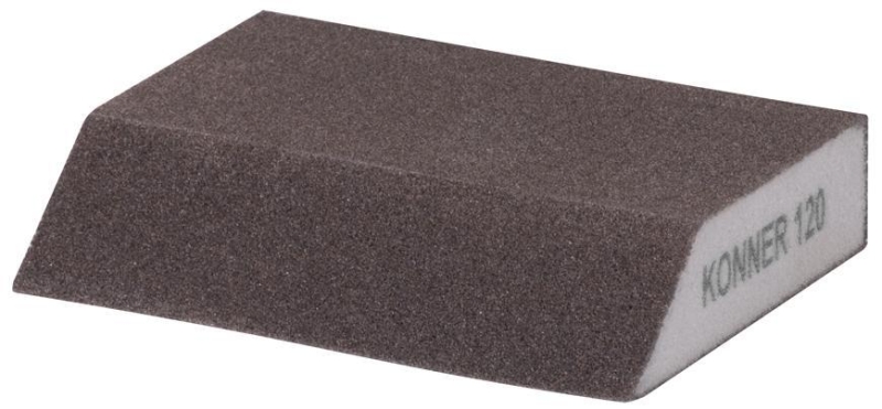 Skosená brúsna huba KONNER je určená na brúsenie sadrokartónov, kovov, plastov, dreva, náterov na tvarované alebo zakrivené aplikácie. Rozmery: 125x90x65x25 mm. Zrnitosť: G120 - vhodná na doleštenie povrchov.
