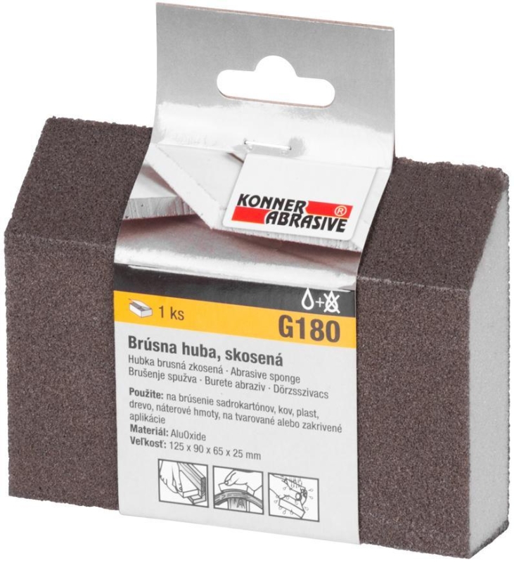 Skosená brúsna huba KONNER je určená na brúsenie sadrokartónov, kovov, plastov, dreva, náterov na tvarované alebo zakrivené aplikácie. Rozmery: 125 x 90 x
