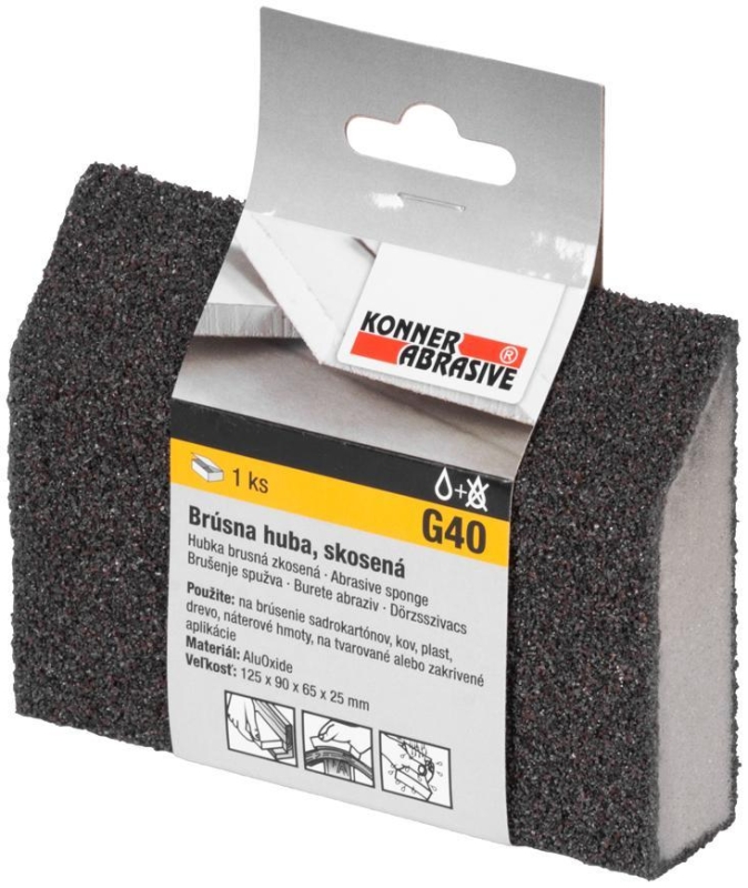 Skosená brúsna huba KONNER je určená na brúsenie sadrokartónov, kovov, plastov, dreva, náterov na tvarované alebo zakrivené aplikácie. Rozmery: 125x90x65x25 mm. Zrnitosť: G40 - vhodná pre hrubé povrchy a predprípravu.