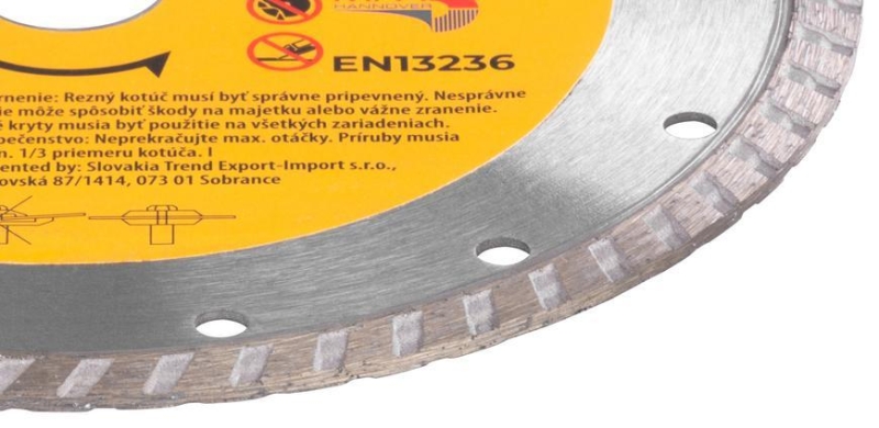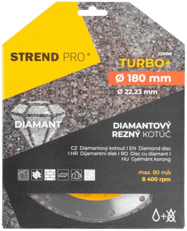 Diamantový kotúč Strend Pro je určený pre domácich kutilov, ale aj pre profesionálnych remeselníkov. Je vhodný na mokré aj suché rezanie. Konštrukcia TURBO+ lemu zachytáva vzduch v pohybe, čím sa zabezpečuje lepšie odvádzanie materiálu čo zaručuje čistejšie rezné hrany bez odlamovania materiálu, rýchlejšie rezy, optimálnu životnosť a zároveň dochádza k redukcii zahrievania. Chladiace otvory pomáhajú zvýšiť viditeľnosť pri rezaní odvádzaním materiálu a zaisťujú rozptyl tepla. Má široké využitie - žula, dlažba, obklad a je možné jeho použitie na mramor, tehly, kameň, murivo a strešnú krytinu. Jeho priemer je 180 mm a maximálne povolené otáčky sú 8 400 rpm.