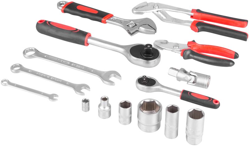 1 ks kliešte na poistné krúžky 150 mm • 1 ks kombinované kliešte 150 mm • 9 ks očkoplochý klúč 8-17 mm •