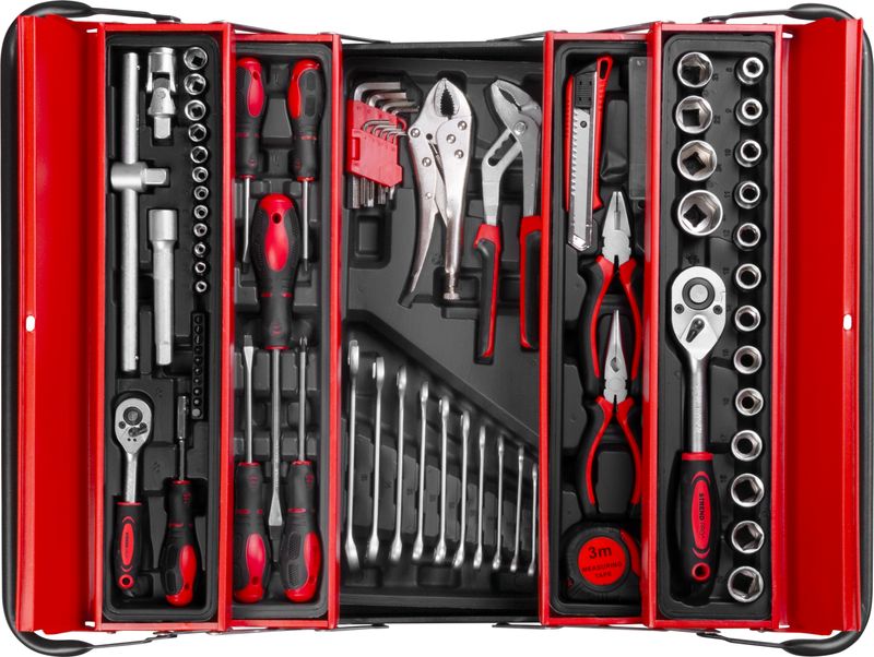 - Komplexná výbava: Sada obsahuje 85 kusov náradia, vrátane širokej škály hlavíc, kľúčov, skrutkovačov, klieští a ďalšieho príslušenstva, čo z nej robí univerzálne riešenie pre rôzne úlohy.
