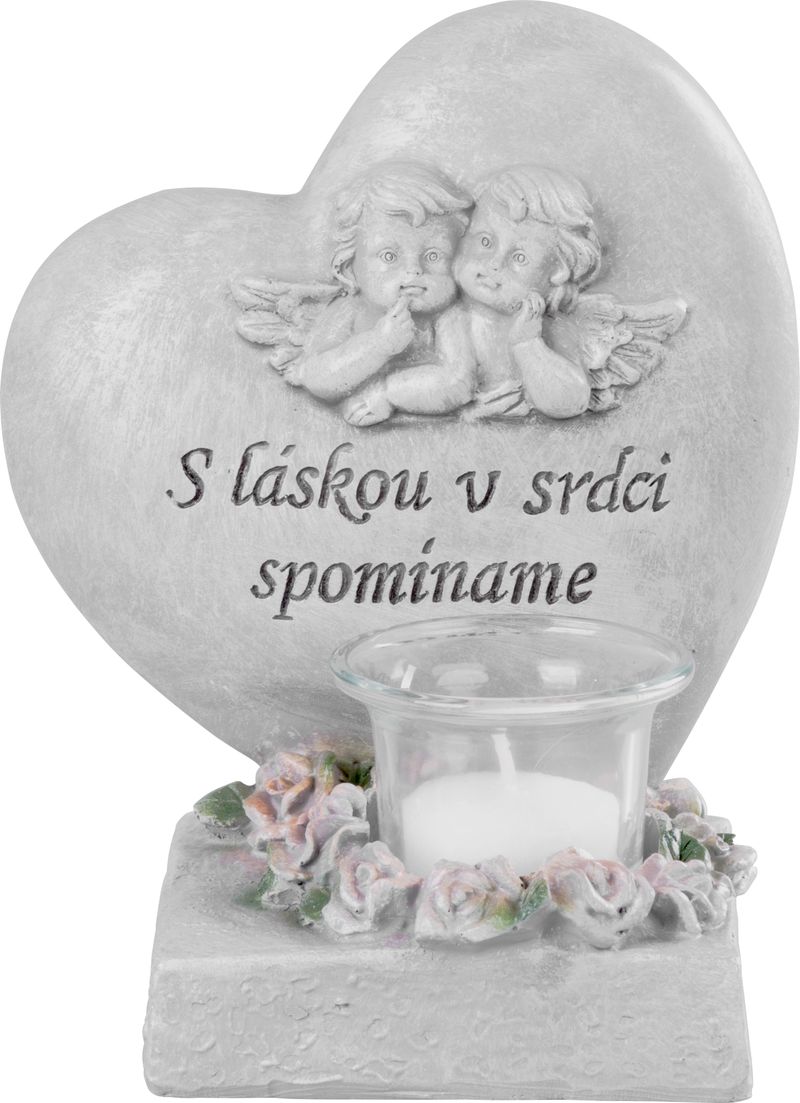 Keramická dekorácia srdce s anjelikmi so sviečkou je vkusná a decentná ozdoba vhodná nielen na hrob, ale aj ako dekorácia do smútočných aranžmánov a ikebán. Zaujímavým prvkom je slovenský názov S láskou v srdci spomíname. Rozmery: 15,5x12x17,5 cm.