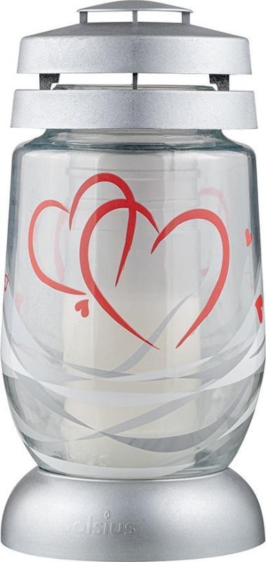 Kahanec Srdcia so striebornými akcentmi. Vyrobené z kvalitného priehľadného skla, cez ktoré je krásne vidieť plameň. Vďaka veľkej základni je veľmi stabilný a vďaka špeciálnej štruktúre a "čiapke" je vložka vo vnútri dokonale chránená proti vetru a vode. Elegantný a moderný, vyzerá skvele ako hlavná dekorácia náhrobných kameňov. Doba horenia: 36 hodín.