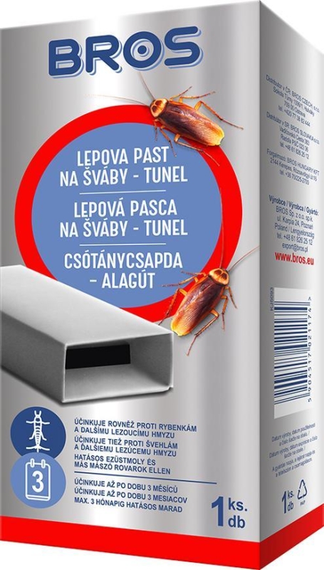 - Lepová pasca na šváby Bros v podobe tunela efektívne zachytáva šváby a strieborné mole. - Konštrukcia pasce skryje uväznený hmyz pred zrakom. - Neobsahuje insekticídy. - Môže byť používaný niekoľko mesiacov, je možné ho použiť v každej miestnosti, dokonca aj v blízkosti detí, pacientov a alergikov. - Pred použitím si prečítajte údaje na obale a pripojené informácie na výrobku.