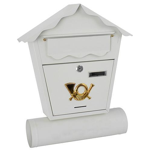 Elegantná poštová schránka v bielej farbe. Obsahuje časť na letáky. Rozmery: 37x10x44 cm. Materiál: kov.