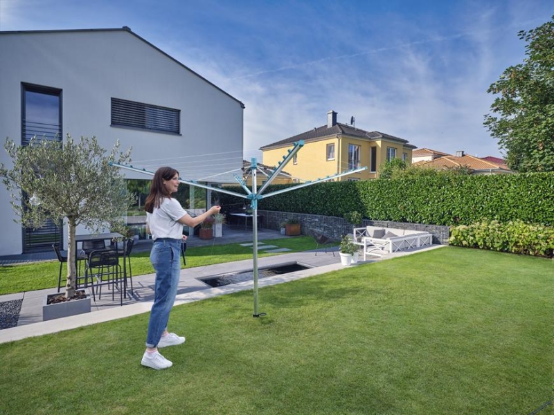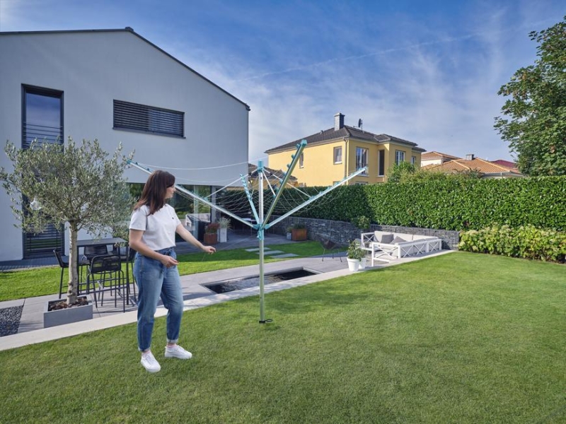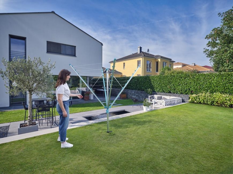 Vonkajší otočný sušiak, odolný voči vplyvom počasia, nehrdzavejúci hliníkový rám, patentovaný systém zaťahovanie šnúr do boční. Šnúry sú chránené pred dažďom a špinou, mechanizmus pre ideálne vypnutie šnúr, možnosť zavesenia ramienok na konce ramien sušiaku. 40 m šnúr = 4 práčky bielizne. Súčasťou balenia je držiak na zabetónovanie.