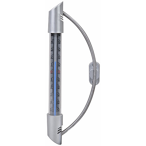 Vonkajší kovový teplomer Strend Pro meria teplotu v rozsahu od 50°C do -50°C. Rozmery: 230x80x25 mm.