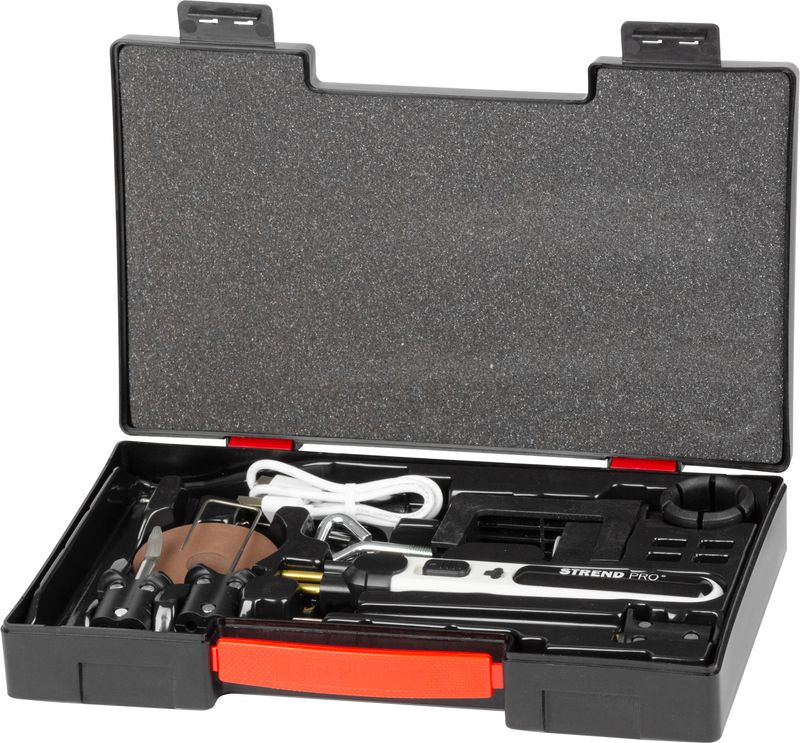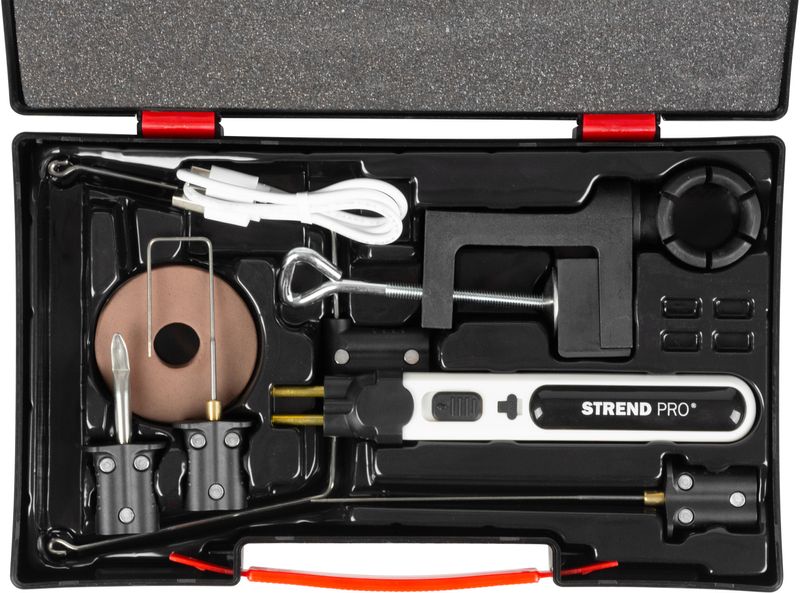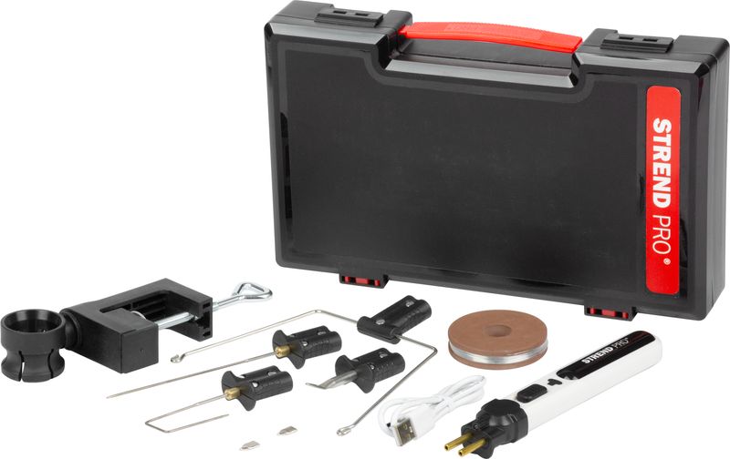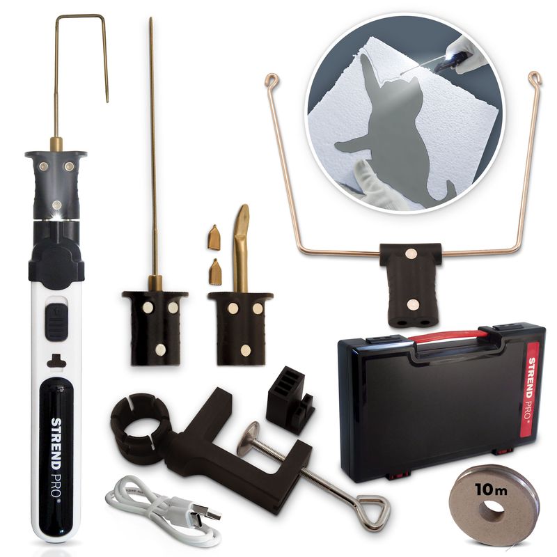 Akumulátorové pero Strend Pro je určené na jemné a presné tvarové vyrezávanie pomocou rezacieho drôtu, na vykonávanie skracovacích rezov a vyrezávanie väčších predmetov nožom z polystyrénu. Sada obsahuje 4 rôzne rezacie nadstavce pre rôzne aplikácie. Vidlica s rezacím drôtom je určená na jemné a presné vyrezávanie, krájanie a tvarovanie materiálu. Rezací drôt v tvare písmena U umožňuje drážkovanie do materiálu pre osadenie káblov. Pomocou rezacej dierovacej ihly je možné vyrezávať rôzne tvary. S použitím špeciálneho hrotu na spájkovanie je akumulátorové pero na rezanie polystyrénu určené aj na vytváranie spájaných spojov pomocou cínovej spájky. Balenie obsahuje akumuátorové pero, vidlicu s rezacím drôtom (10 m x 38 mm), rezací nôž v tvare U, rezaciu ihlu, svorku na upevnenie k pracovnému stolu, nadstavec so spájkovacím hrotom a USB-C nabíjacím káblom.