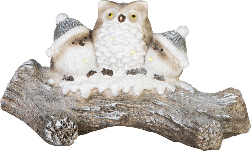 Dekorácia MagicHome Vianoce, sovy na zasneženom kmeni, LED, 20.5x49.5x27.5 cm