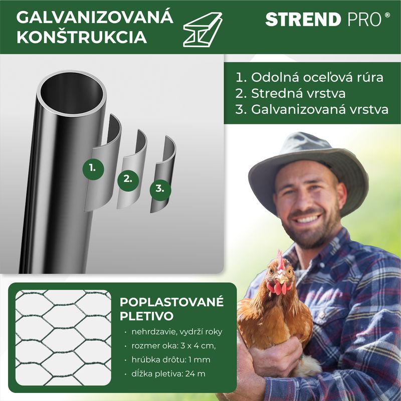 • Pletivo s jemnými okami: Rozmer oka pletiva je 3 x 4 cm, hrúbka drôtu 1 mm a dĺžka pletiva 24 m, čo účinne chráni hydinu pred predátormi a zabezpečuje dobrú cirkuláciu vzduchu.