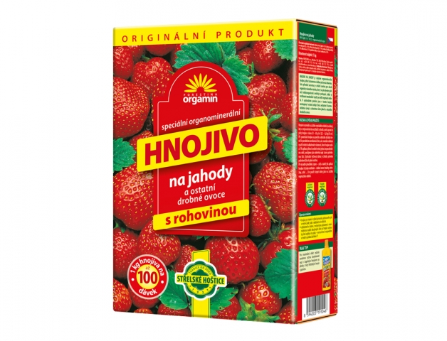 Speciální granulované biominerální hnojivo na jahody. S kvalitní mletou rohovinou, které působí jako bohatý, harmonicky vyvážený zdroj všech živin od začátku vegetace až do pozdních období. Zesiluje biologickou činnost půdy, zlepšuje půdní strukturu a dýchání kořenů, zvyšuje odolnost proti houbovým chorobám a reguluje vodní režim rostlin. Hnojení se provádí na začátku vegetačního období (cca duben), kdy se stejnoměrně do meziřádku rozhodí a poté zapraví do půdy hnojivo v dávce 50 – 80 g/m2. Při ponechání hnojiva na povrchu substrátu dochází rovněž k pozvolnému uvolňování živin, ale s menším efektem využití všech kvalitativních vlastností, které hnojivo nabízí. Při aplikaci přímo k rostlině nebo jejímu bezprostřednímu okolí, použijeme jako odměrku např. starou polévkovou lžíci. Optimální výživová dávka je zhruba polovina polévkové lžíce k jedné rostlině. Při výsadbě jahodníku (srpen – září) a taktéž při aplikaci hnojiva i k jiným rostlinám – drobné ovoce (maliny, ostružiny, rybíz ...) lze použít stejné dávky jako na začátku vegetačního období. Při dávkování 50 g na m2 vystačí balení na 20 m2. Složení: 8% N, 8% P2O5, 10% K2O, 3% MgO. Velikost balení: 1 kg.