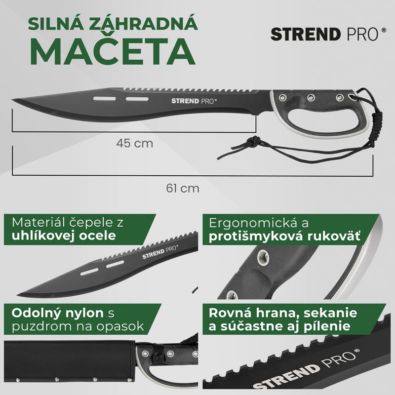 Mačeta Strend Pro Tactical pre všetky práce v lese či na záhrade. Extra ostrá čepeľ s pílkou umožňuje presné a čisté rezy bez námahy. Komfortná rukoväť s ochranou ruky chráni pred zbytočným zranením. Disponuje praktickým putkom na zavesenie za opasok. Spolu s puzdrom s klipsom na rukoväť tak získate vhodne zabalenú mačetu na bezpečnú prepravu počas prác v lese a záhrade. Čierny náter chráni ostrie pred koróziou. Celková dĺžka mačety je 61 cm.