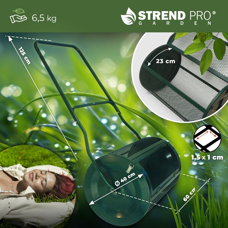 Tento valec na substrát je ideálny pomocník pre rovnomerné a efektívne rozloženie substrátu na záhrade alebo v skleníku. Vďaka rozmerom 60 x 40 x 125 cm a kapacite 75 litrov umožňuje pracovať na väčších plochách s minimálnou námahou.