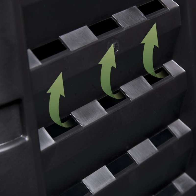 - Špeciálny tvar zaisťuje rovnomernú cirkuláciu vzduchu, umožňuje zavlažovanie kompostu a urýchľuje proces rozkladu.