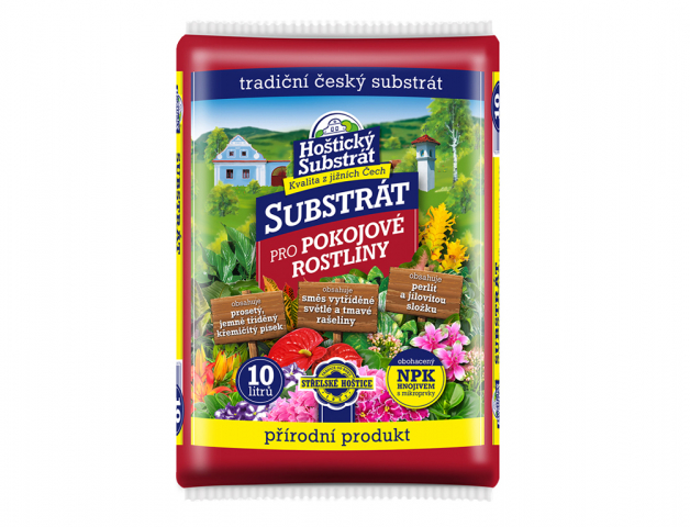 Hoštický substrát pro pokojové rostliny je vyroben ze směsi vytříděné světlé a tmavé rašeliny, prosetého jemně tříděného křemičitého písku, perlitu, přírodní jílovité složky a minerálního vícesložkového hnojiva s mikroprvky. Půdní reakce je upravena jemně mletým dolomitickým vápencem. Substrát je určen pro sázení a přesazování všech druhů pokojových rostlin. Má jemnou strukturu a díky perlitu i vysokou vzdušnost. Díky obsahu jílovité složky má vyšší poutavost vláhy i živin a zamezuje jejich vyplavování. Obsahuje potřebné množství základních i stopových živin na prvních cca 6 týdnů pěstování. Balení: 10 l.