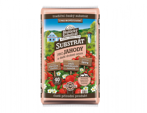 Substrát je vhodný pro jahody a další drobné ovoce. Je vyroben ze směsi světlé a tmavé rašeliny, jemné lávy, jílové složky a organického Hoštického hnojiva s mikroprvky. Barvy: 40 l.